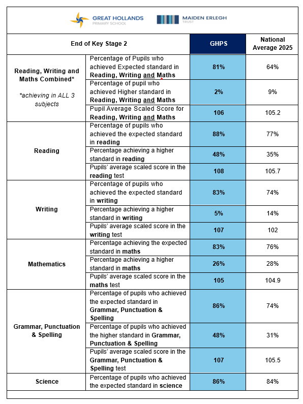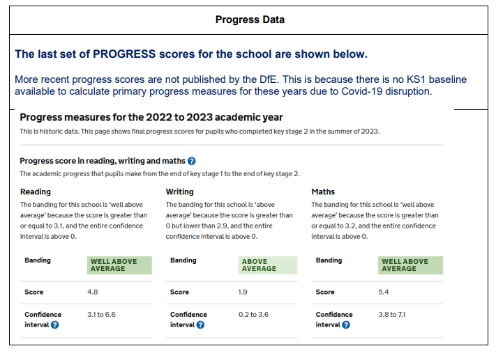 To find the school's latest published performance information, please visit www.compare-school-performance.service.gov.uk/ to see and compare our School Performance Tables.