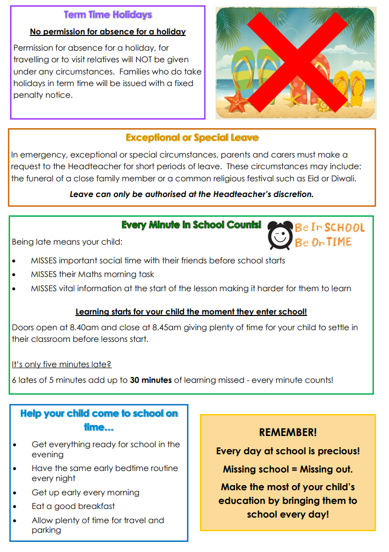 Please ensure that your child arrives at school on time. Learning begins as soon as the children enter the classroom and a late arrival is disrupting for the whole class.