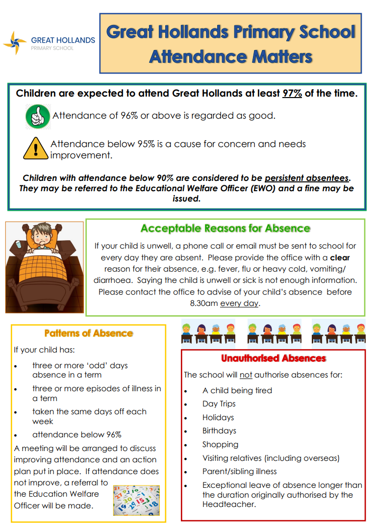 Children are expected to attend Great Hollands Primary School at least 97% of the time. Our School Attendance Policy can be found on our Key Policies page.